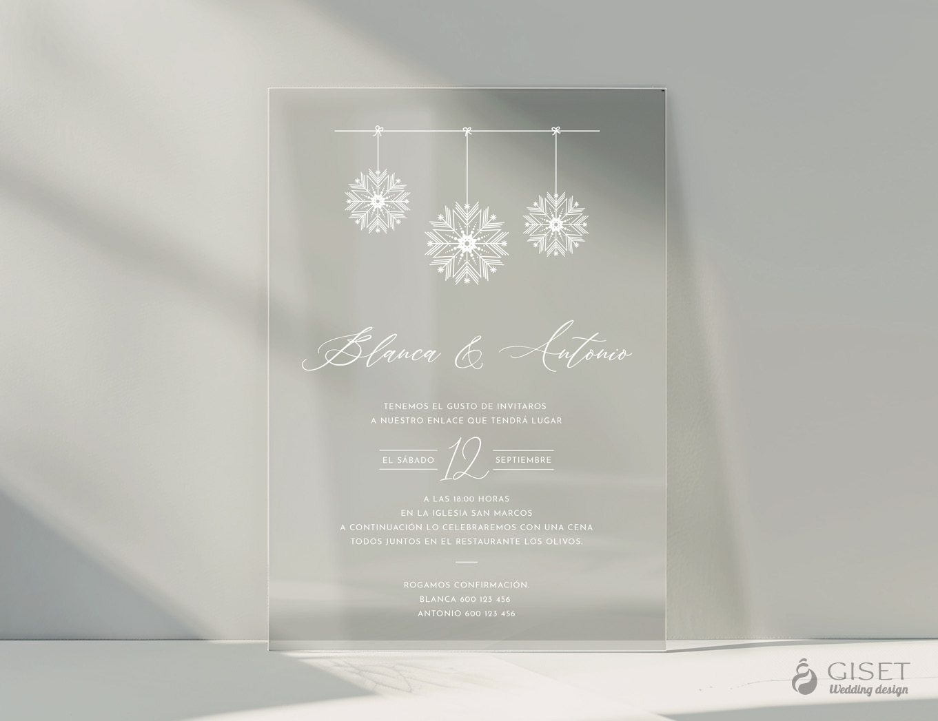 – Tarjetón adicional 21×14,8cm (A5) o 15x15cm con impresión digital por una cara en el mismo material transparente y tamaño que elijas para tu invitación.